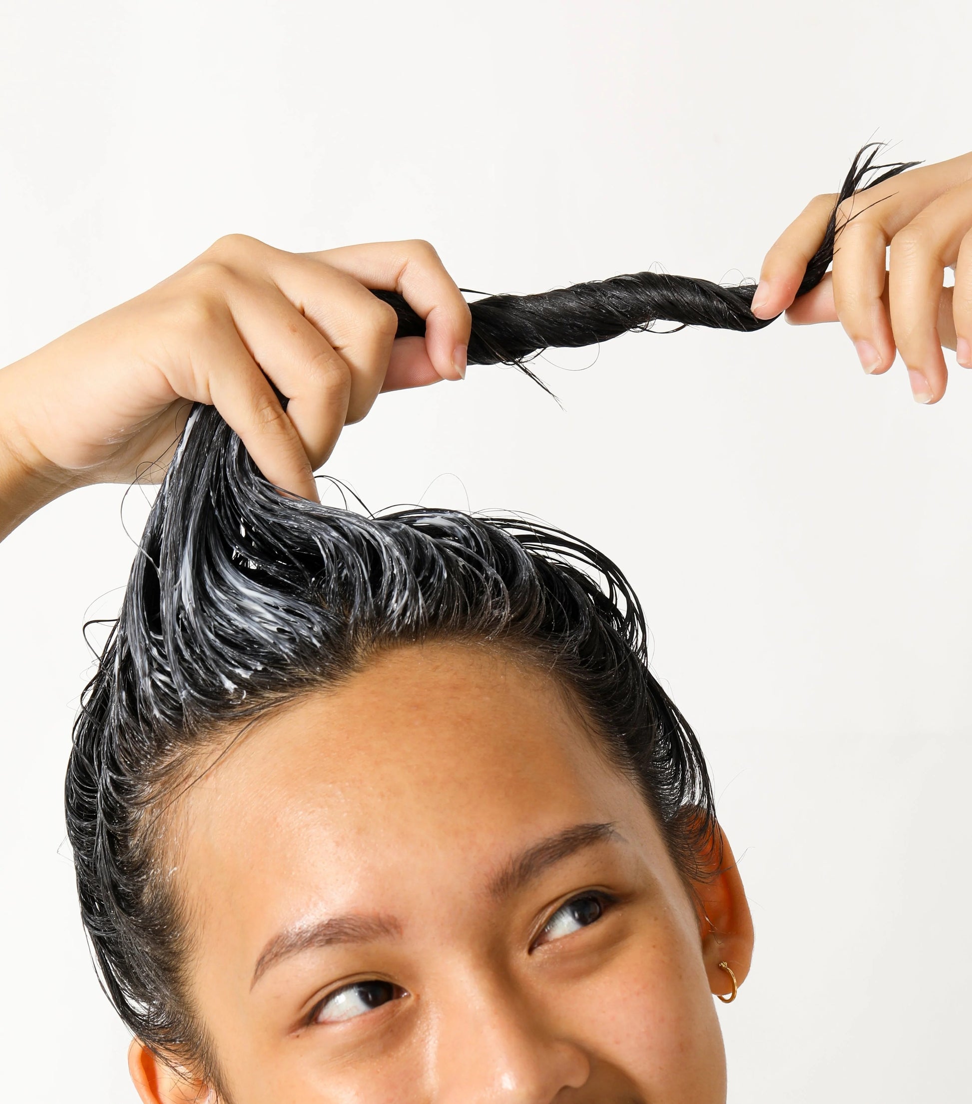 1. Shampoo your hair as normal then evenly distribute a generous amount of product to your hair.